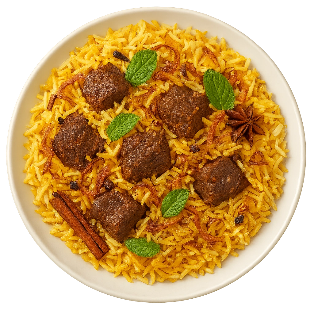 Fragrant basmati rice layered with tender, spiced beef slow-cooked to perfection.