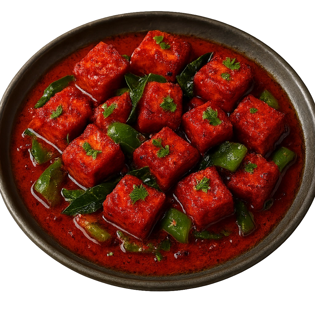 Crispy marinated paneer cubes tossed in spicy, tangy South Indian-style masala with aromatic herbs.