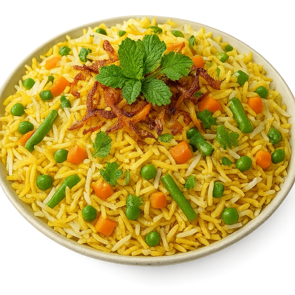 Aromatic basmati rice cooked with fresh mixed vegetables and fragrant Indian spices.